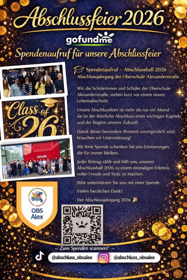 Damit dieser Moment für uns alle unvergesslich wird, freuen wir uns über jede Unterstützung. Mit Ihrer Spende helfen Sie uns, den Abschlussball 2026 zu einem schönen und besonderen Erlebnis für alle Schülerinnen und Schüler zu machen.