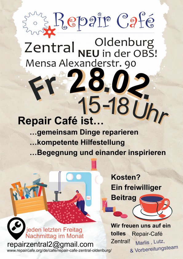 Wie immer am Monatsende ist der letzte Freitag im Monat der Termin für das Repair-Café Zentral, welches von 15-18 Uhr in der Schulmensa stattfindet. Repariert werden u.a. Fahrräder, Elektrogeräte, Textilien, Holzgegenstände, Laptops und Smartphones. Beim letzten Mal Ende November wurden knapp 30 Gegenstände zum größten Teil erfolgreich repariert und somit vor dem Wegwerfen gerettet. Darüber freuten sich alle Beteiligten.